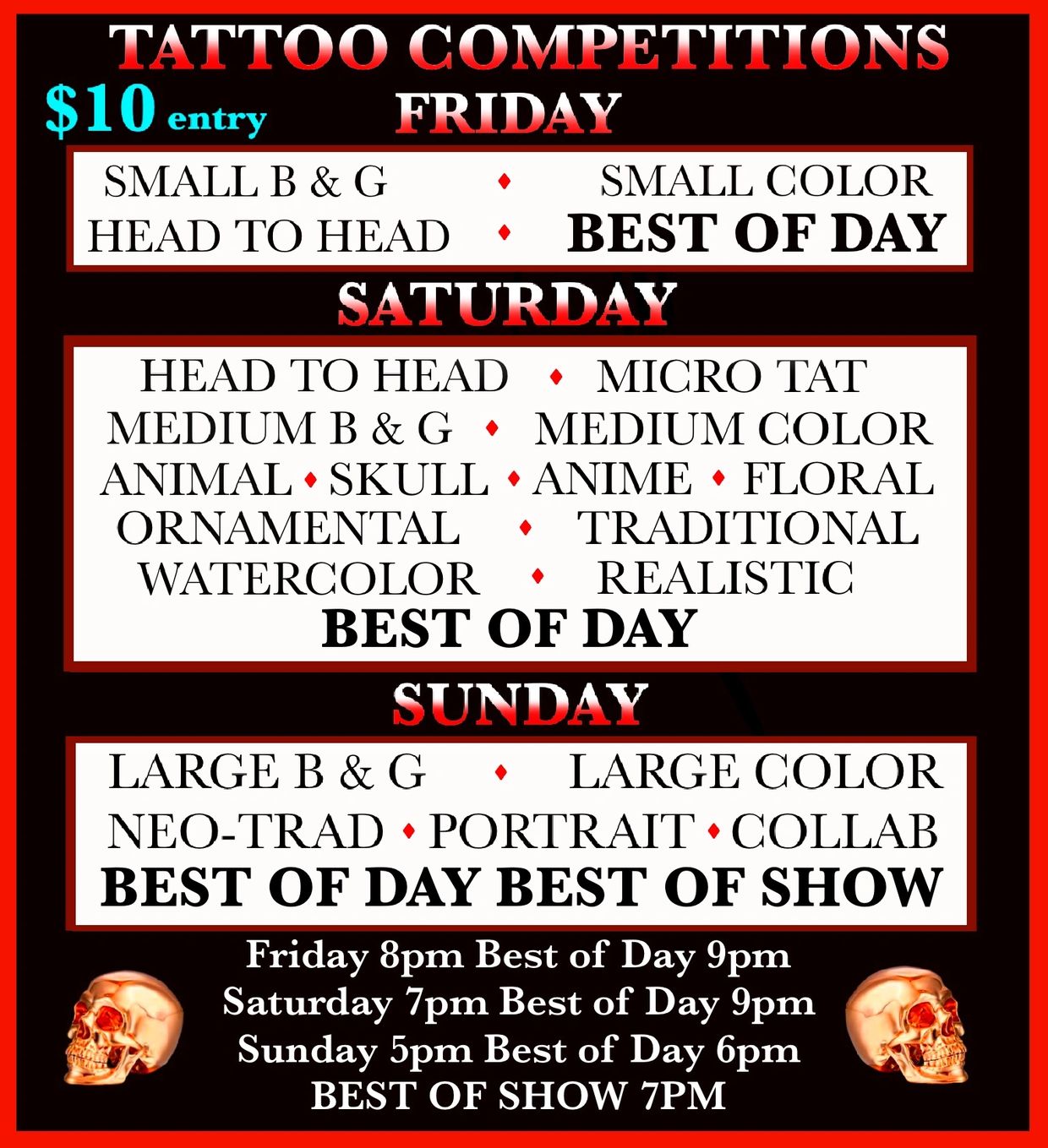Sign ups are $10 each at the information booth. Tattoos can be fresh or existent. For head to head competitions they will be live and fresh. Best of days will be done in the facility only. Also the best of show competition must be done. 100% at the show.